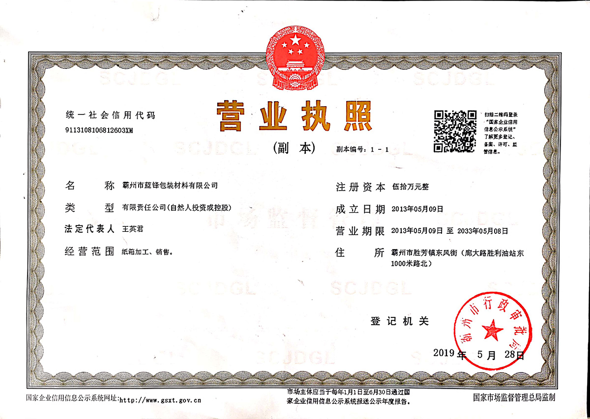 立即咨詢霸州市藍鋒包裝材料有限公司,前身為成立于1988年的勝芳鎮(zhèn)藍劍紙箱廠。是河北省較早涉足紙包裝制品的民營企業(yè)。經(jīng)過近三十年的發(fā)展,公司已經(jīng)由起初的家庭作坊發(fā)展為現(xiàn)有標(biāo)準(zhǔn)化廠房8000平米,員工50人,其中管理人員7名;年產(chǎn)紙箱上億平米的現(xiàn)代化企業(yè)。